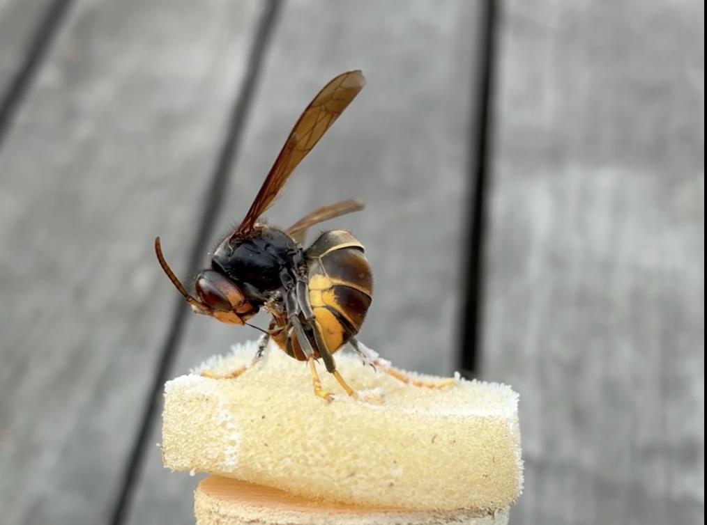 Wichtig bei allen Schritten ist eine ausreichende Schutzkleidung. Der Stachel der Asiatischen Hornisse ist länger als der einer Honigbiene (ca. 2,5 mm), und neben dem Stechen kann die Hornisse auch gezielt Gift verspritzen. Jeder Einsatz erfordert daher Erfahrung, Vorsicht – und Nerven wie Drahtseile, denn die Hornissen sind flink, zahlreich und keineswegs ungefährlich.